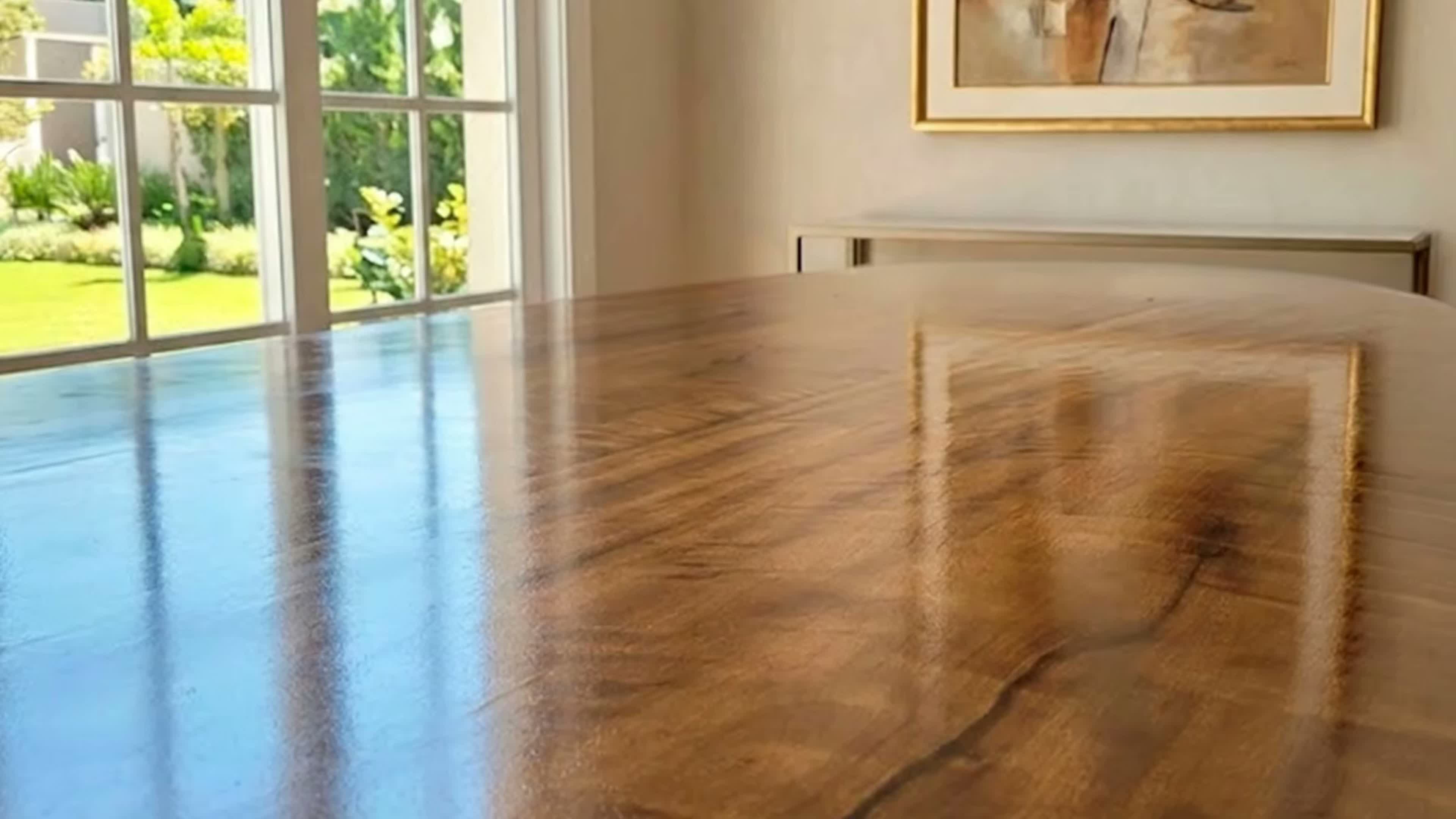 O calor natural da madeira sob uma barreira de alta proteção. O acabamento em alto brilho não apenas espelha a iluminação do seu ambiente de forma deslumbrante, mas cria uma blindagem invisível contra líquidos e desgastes diários. Um luxo feito para ser usado, sem a necessidade de preocupações.